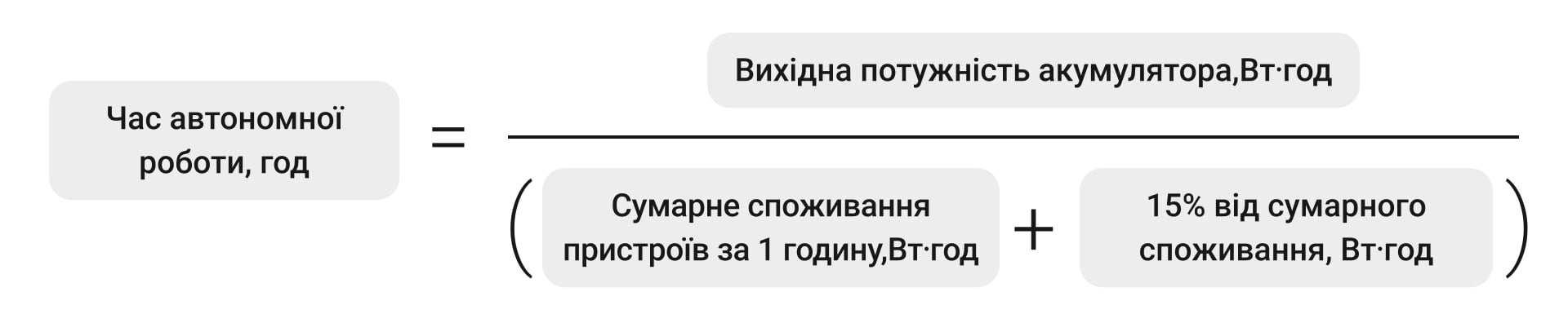 Підсумуйте споживання необхідних пристроїв та розрахуйте час роботи від резервного живлення за формулою нижче. Зверніть увагу, що для пристроїв із високим пусковим струмом краще брати максимальне значення споживання, що вказане виробником в його технічних характеристиках. У формулу додано 15% від сумарної потужності пристроїв для врахування можливих втрат у перетворювачах напруги або періодичне збільшення споживання приладів.