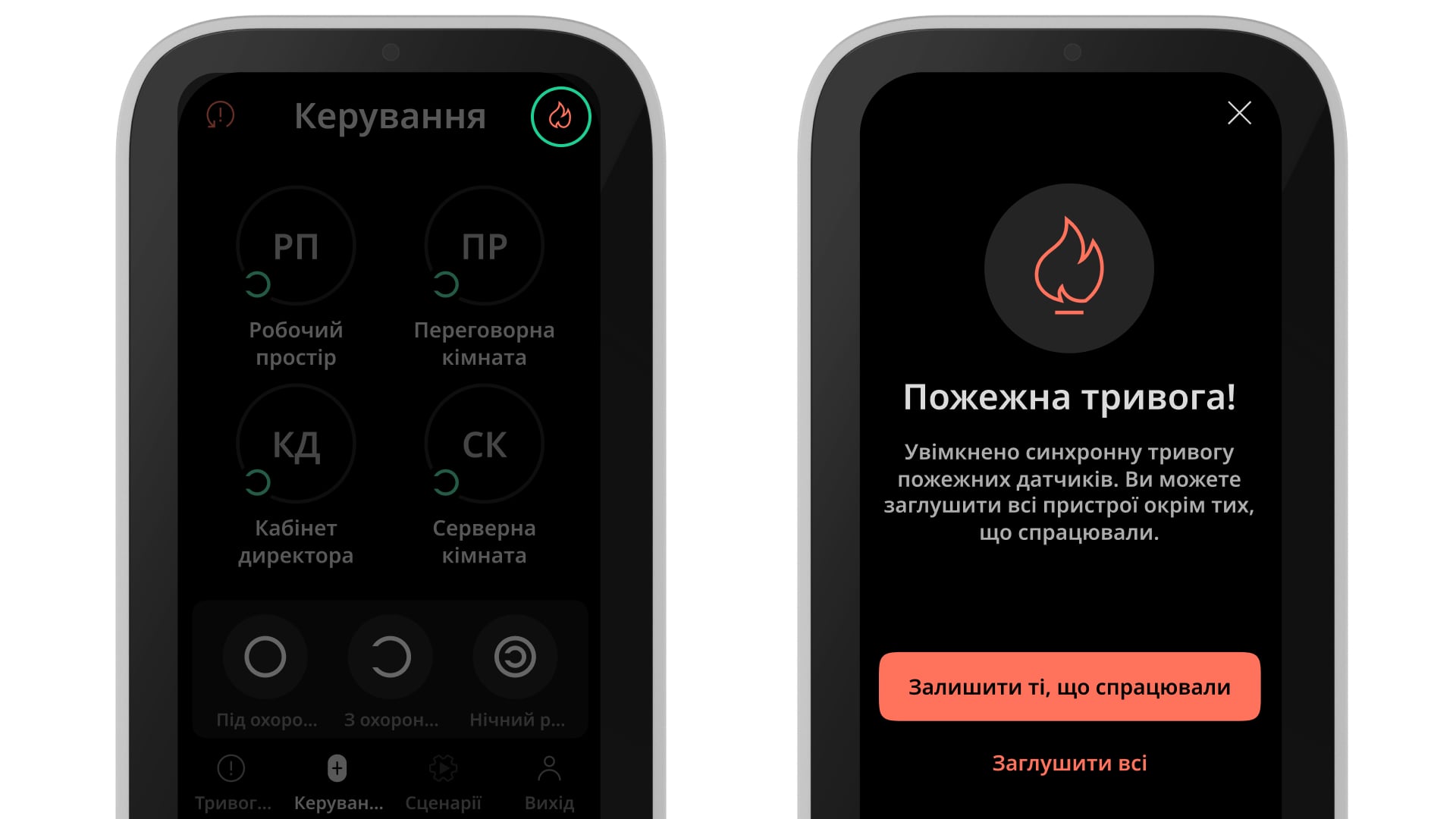 Зверніть увагу, що сигнали тривоги про Критичний рівень чадного газу та Критичний рівень задимлення не можна заглушити з клавіатури. Аналогічно, якщо пожежну тривогу активовано за допомогою ручної пожежної кнопки ManualCallPoint Jeweller, її також не можна заглушити таким способом.