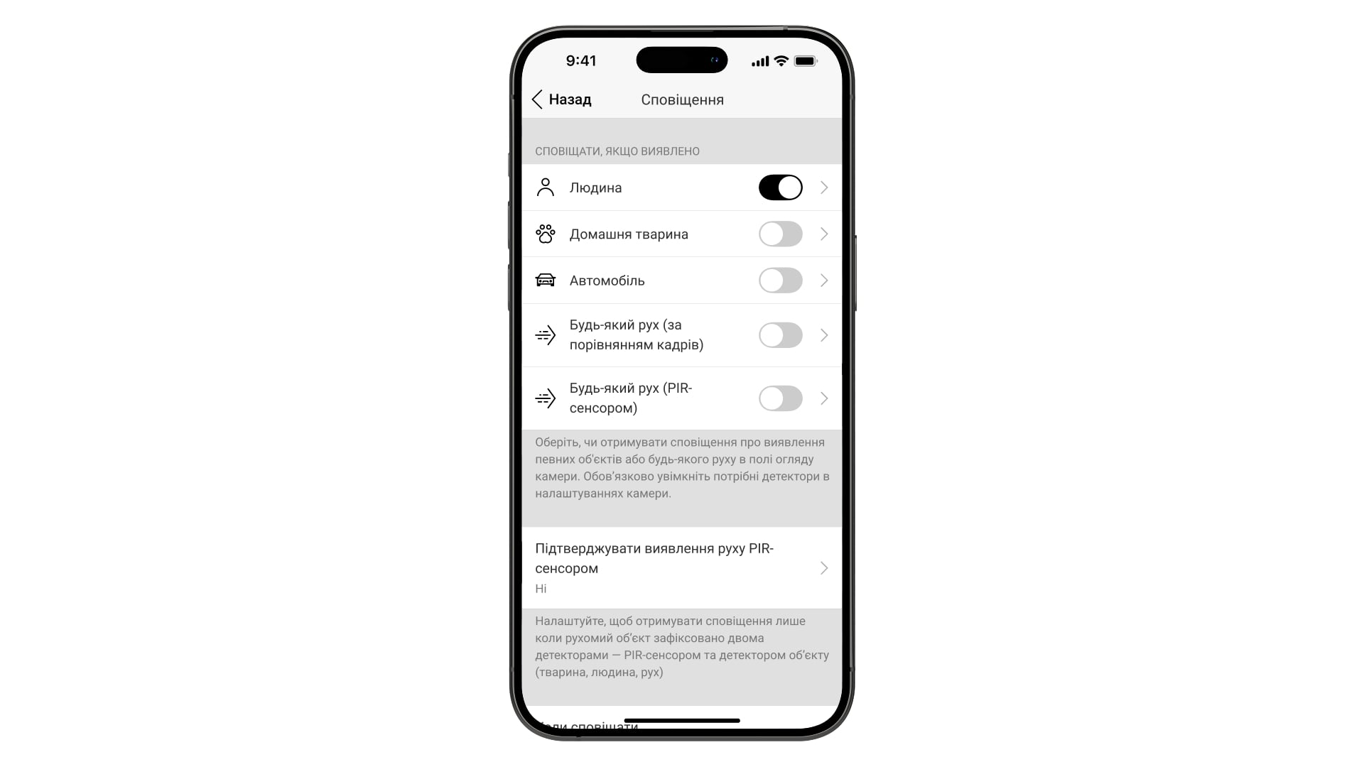 Крім того, користувачі можуть налаштувати сповіщення за типом виявленого обʼєкта чи руху: Людина, Домашня тварина, Автомобіль або Будь-який рух (зафіксований у кадрі чи виявлений вбудованим ІЧ сенсором).